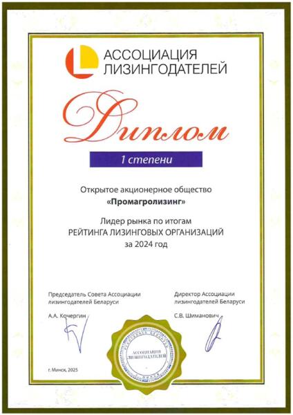 Помимо этого, Обществу был вручен диплом за 1 место по объему операций на биржевом валютном рынке среди лизинговых компаний в 2024 году от ОАО «Белорусская валютно-фондовая биржа».