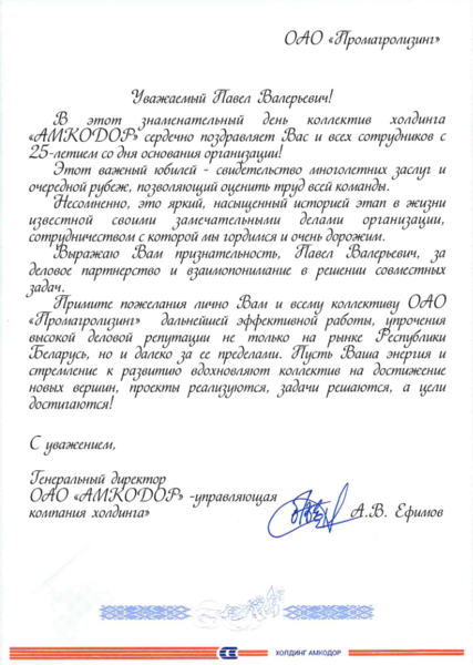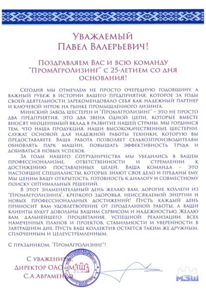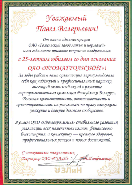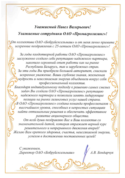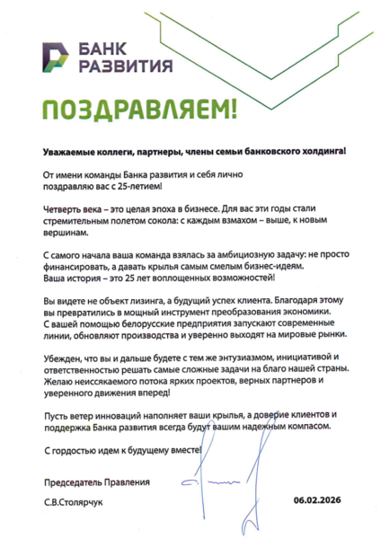 В эти дни Промагролизинг принимает особенно много теплых слов - нас поздравляют с 25-летием партнеры, коллеги и официальные лица нашей страны. Этот поток внимания стал для нас лучшим доказательством того, что мы движемся в правильном направлении. И мы признательны каждому за ваши добрые слова и поддержку.