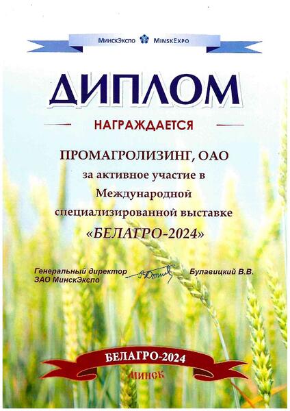 По итогам Белорусской агропромышленной недели Общество награждено дипломом за активное участие в 34-й Международной специализированной выставке «Белагро-2024».